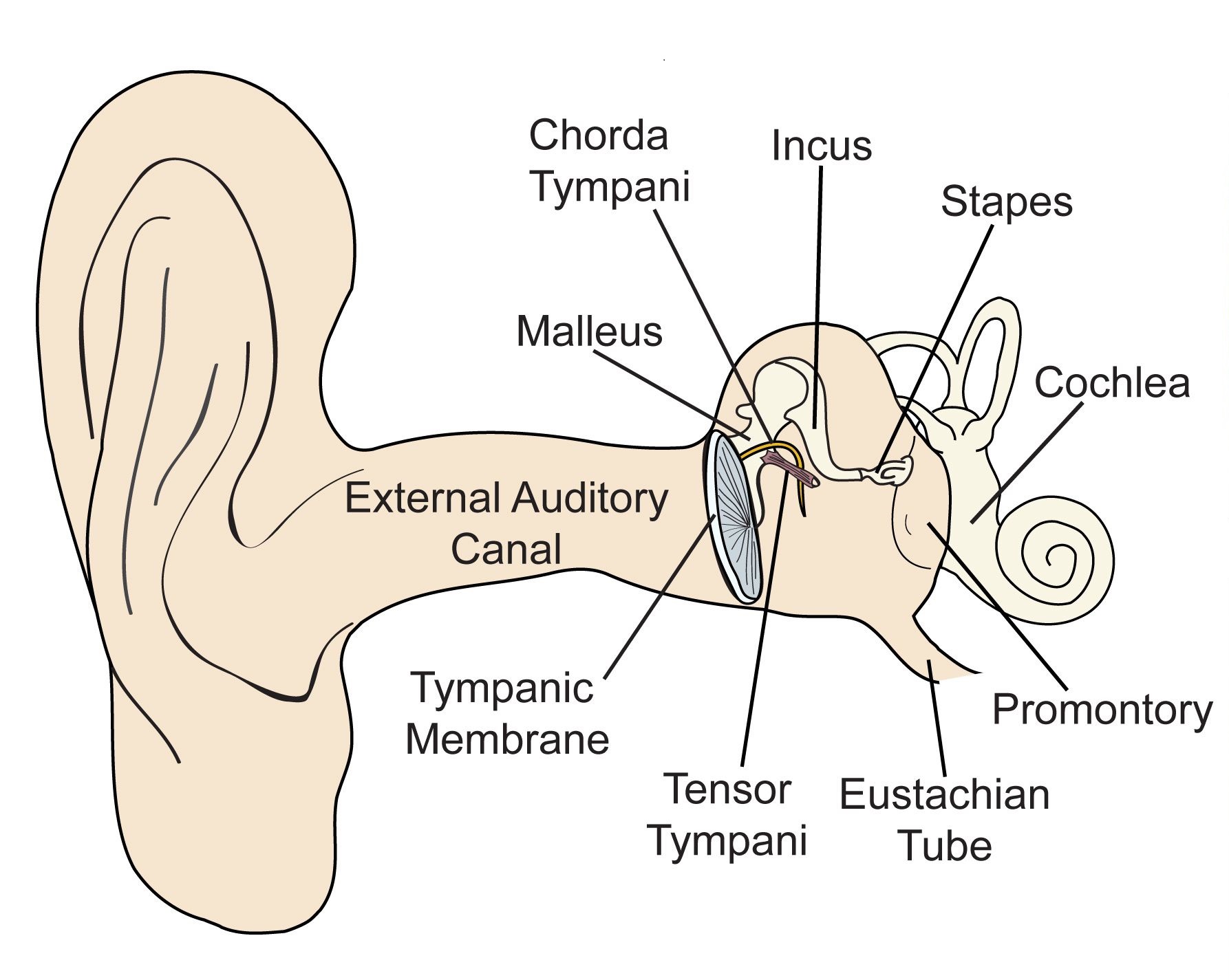The physiology of the middle ear also includes the eustachian tube, which opens up at the rear end of the throat, and allows for the pressure on both sides of the ear drum to be equalised for healthy transmission of sound vibration.